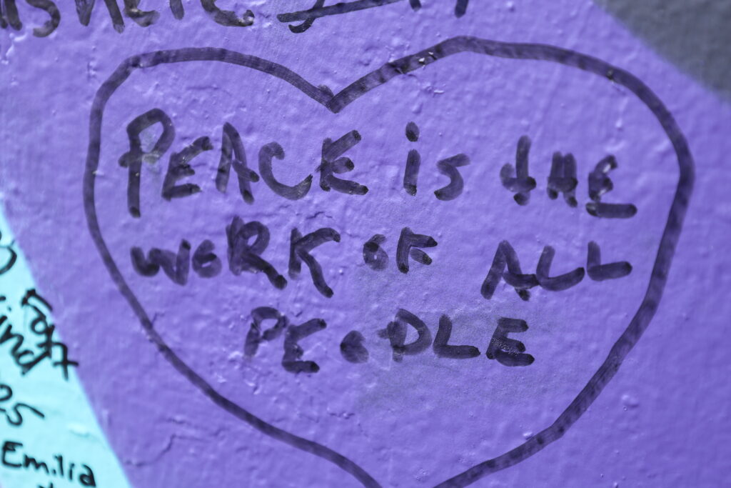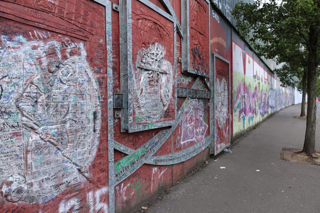 We traveled by bus to the Shankill Road area, the scene for much of the sectarian violence that ended toward the late 1990’s. Walls throughout the area are adorned with graffiti and elaborate images depicting one side or the other’s political positions. I especially liked the sentiment of an anonymous Philly 2025 visitor below.