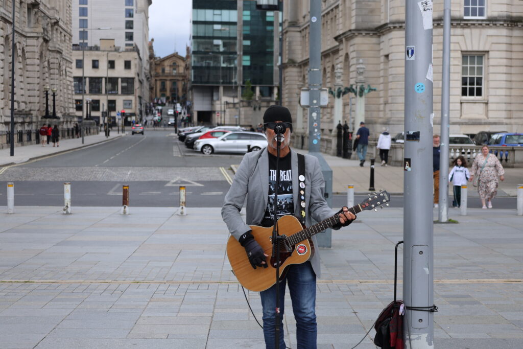 A busker serenading the tourists as they pose for photos by the iconic Beatles statue.